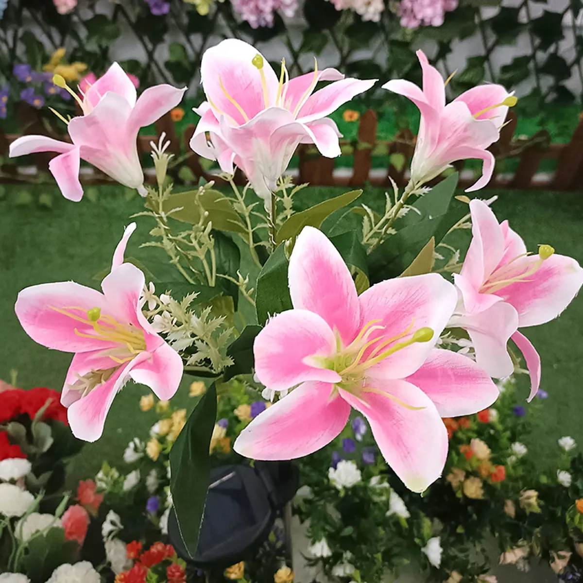 2. Імітація букета лілій: цей ліхтар із сонячною лілією розроблений із 7 головками, що імітує букет лілій, реалістичний, красивий і зворушливий, ви можете прикрасити свій дверний отвір і двір. Світлодіоди яскраві та міцні, з видатним світловим ефектом у нічну пору, дуже гарні та затишні.